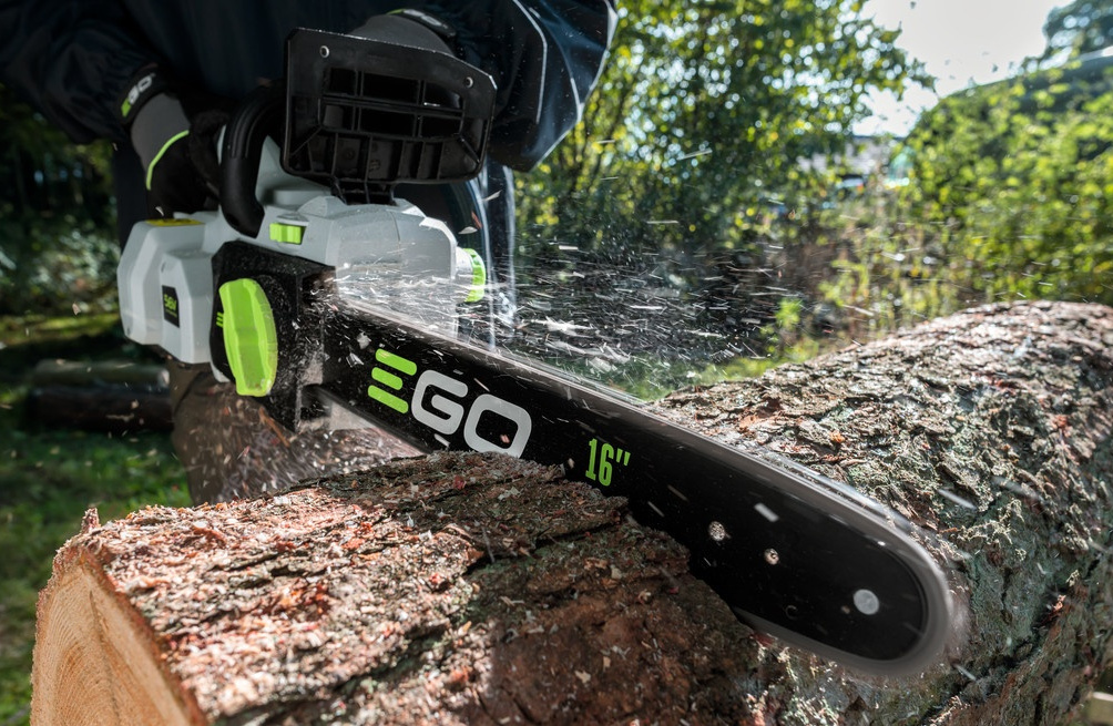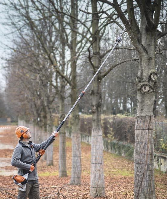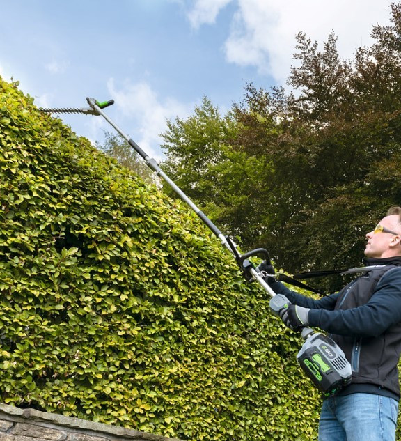 EGO takkenzaag op steel voor het op hoogte snoeien van takken op accu (huurprijs is excl. accupakket / slijpkosten ketting)