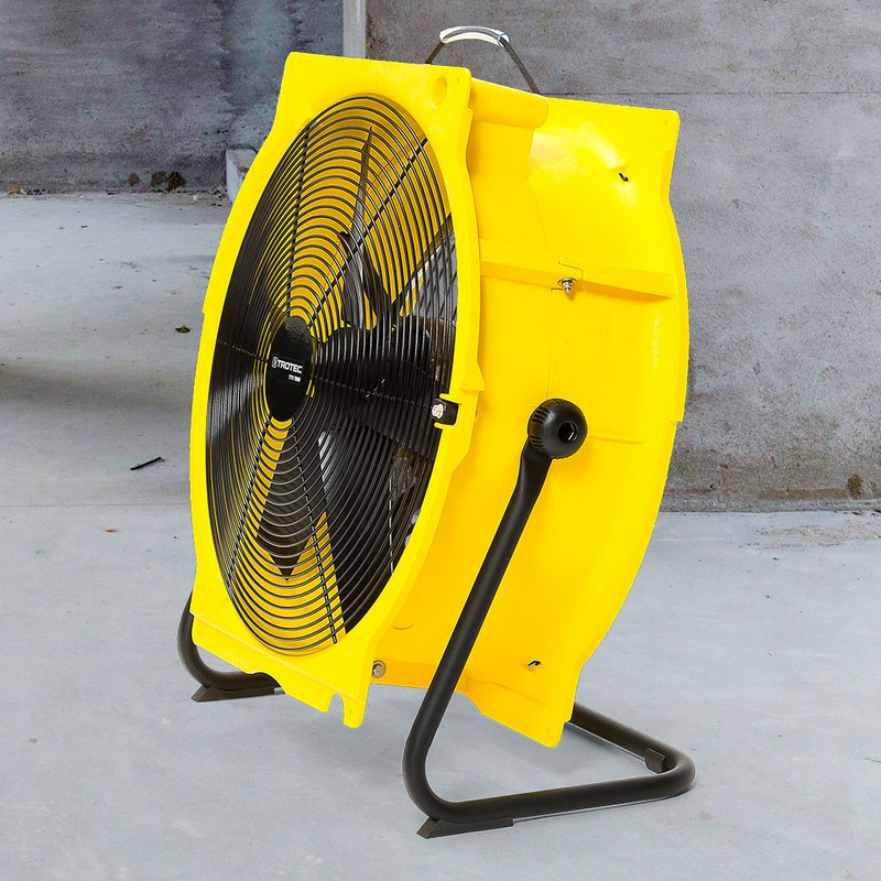 2) droog ventilatoren, lucht verplaatst zich niet van zichzelf, de ventilator verplaatst de gedroogde lucht weg van de bouwdroger en blaast deze met kracht langs de te drogen wanden, vloeren of andere ruimtes (aanzienlijk sneller droogproces).